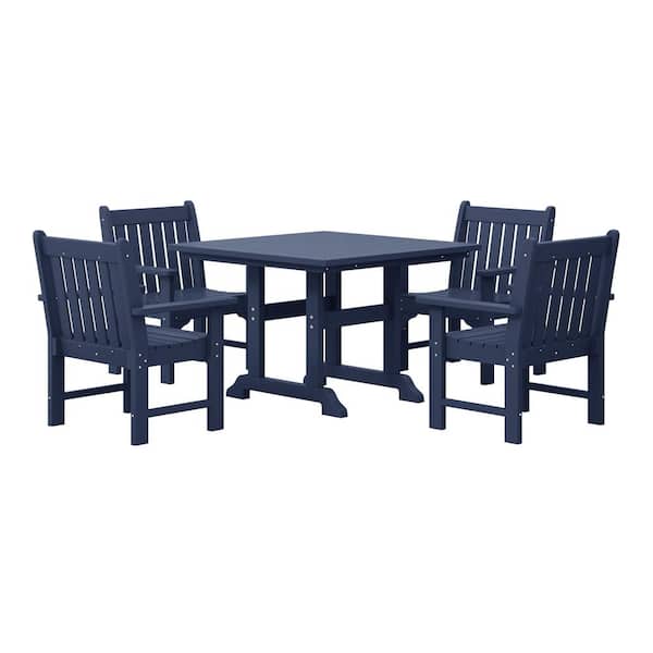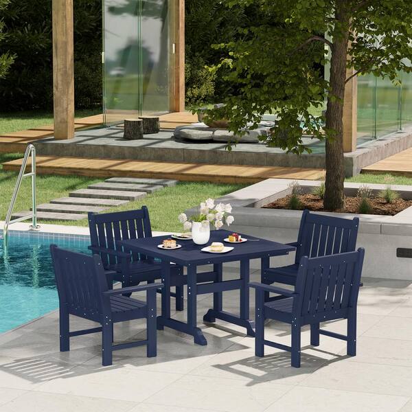 Laguna 5-PCOutdoor Patio Poly Plastic Fade Resistant Garden Arm Chair and Square Trestle Table Dining Set in Navy Blue