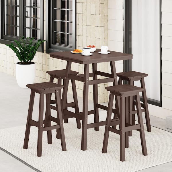 Laguna 5-Piece Fade Resistant HDPE Plastic Outdoor Patio Square Bar Height Pub Set, Matching Barstools in Dark Brown