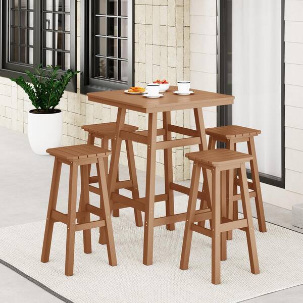 Laguna 5-Piece Fade Resistant HDPE Plastic Outdoor Patio Square Bar Height Pub Set, Matching Barstools in Teak