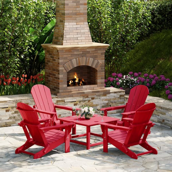 Laguna Red Plastic Weather Resistant Adirondack Chair 5-Piece Outdoor Patio Conversation Set, Square Coffee Table