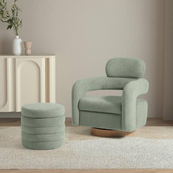 Bayville Modern 2-Piece Sherpa Swivel Accent Chair Set with Round Storage Footstool Ottoman in Ice Green