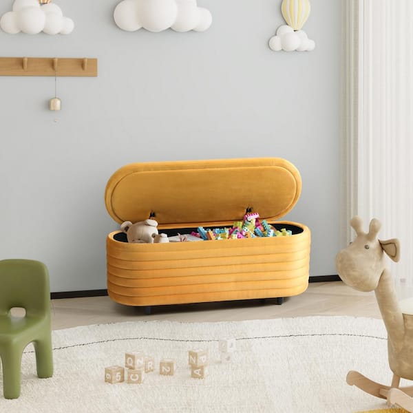 Farrah 42 in. Wide Oval Velvet Upholstered Entryway Flip Top Storage Bedroom Accent Bench in Mustard