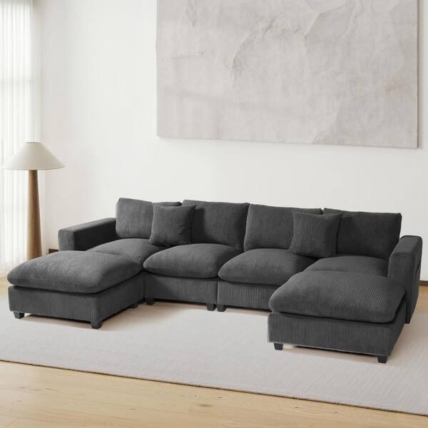 Hamilton 128 in. Square Arm 6-Piece Corduroy Modular Sectional Sofa Ottoman Set w/ USB Charge Port in. Charcoal Gray