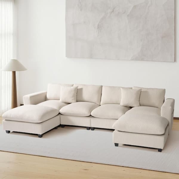 Hamilton 128 in. Square Arm 6-Piece Corduroy Modular Sectional Sofa Ottoman Set w/ USB Charge Port in. Cream