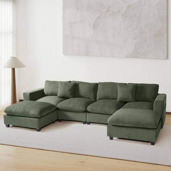 Hamilton 128 in. Square Arm 6-Piece Corduroy Modular Sectional Sofa Ottoman Set w/ USB Charge Port in. Olive Green