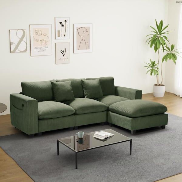 Hamilton 99 in. Square Arm 4-Piece Corduroy Upholstered Modular Sectional Sofa Set w/ USB Charge Port in. Olive Green