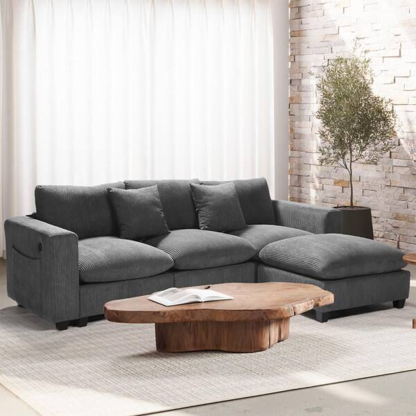 Hamilton 99in. Square Arm 4-Piece Corduroy Upholstered Modular Sectional Sofa Ottoman w/USB Charge Port in Charcoal Gray