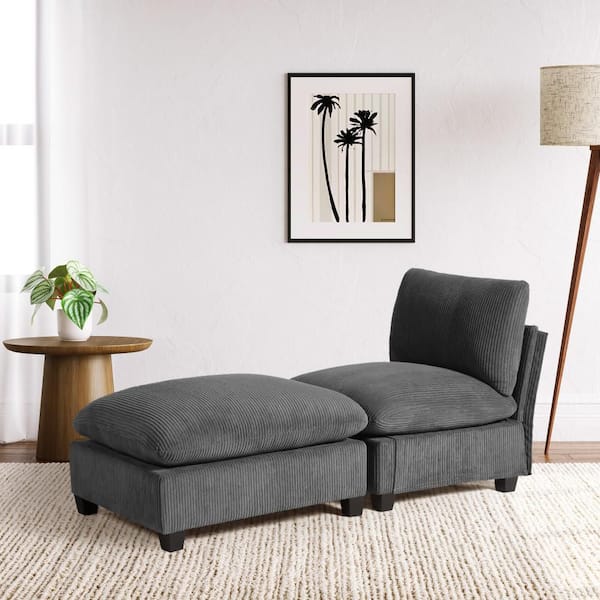 Hamilton Corduroy Upholstered Armless Single Modular Sofa Accent Chair with Footstool Ottoman Set, Charcoal Gray