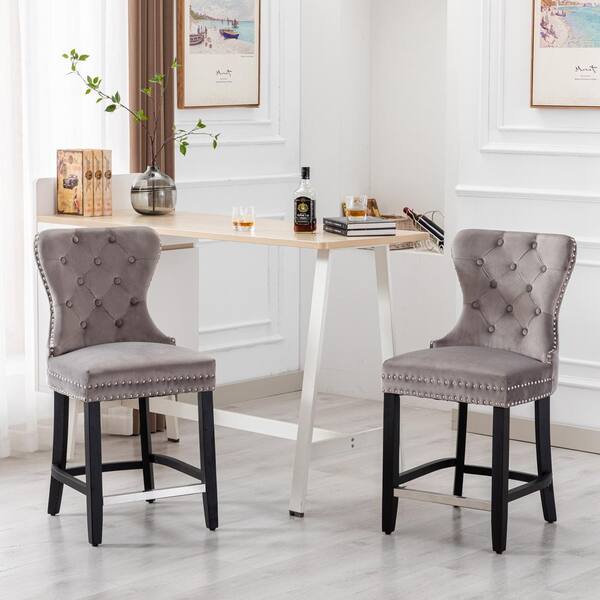 Harper 24 in. Gray Velvet Tufted Wingback Kitchen Counter Stool with Black Solid Wood Frame (Set of 2)