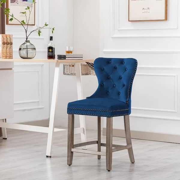 Harper 24 in. High Back Nail Head Trim Button Tufted Royal Blue Velvet Counter Stool w/Solid Wood Frame in Antique Gray