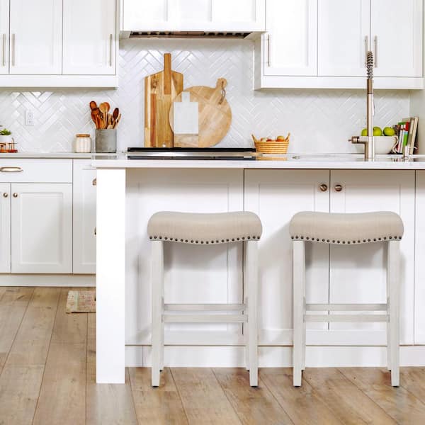 Jameson 29 in. Bar Height Antique White Wood Backless Barstool with Beige Upholstered Linen Saddle Seat Stool (Set of 2)