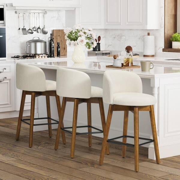 Stansberry 26 in. Chenille Upholstered Low Back Wood Kitchen Counter Stool w/ Swivel (Set of 3), Cream