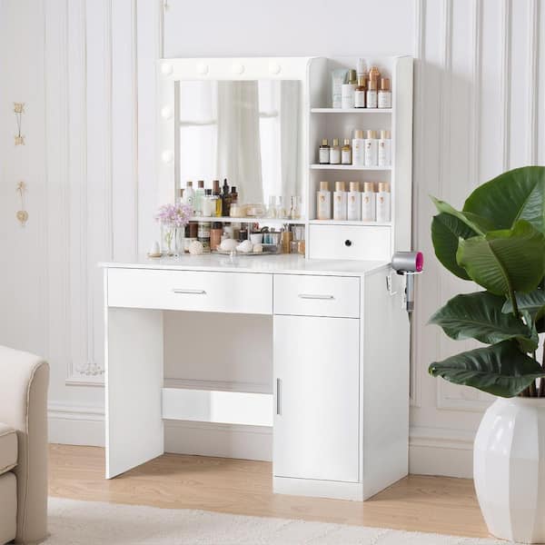 1-Door White Makeup Vanity Dressing Table with Adjustable Mirror, 4-Shelves Power Outlet, for Women Girls Bedroom