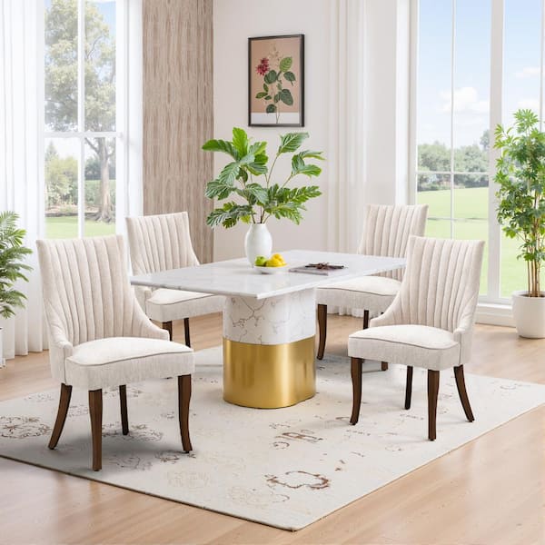 Chic Beige Linen Channel Tufted Back Dining Chairs Set of 4 with Curved Solid Wood Legs for Dining Room