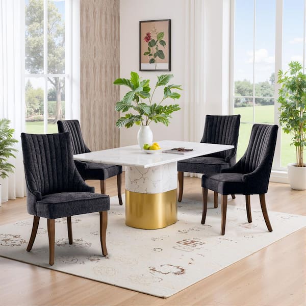 Chic Black Linen Channel Tufted Back Dining Chairs Set of 4 with Curved Solid Wood Legs for Dining Room