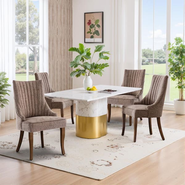 Chic Brown Linen Channel Tufted Back Dining Chairs Set of 4 with Curved Solid Wood Legs for Dining Room