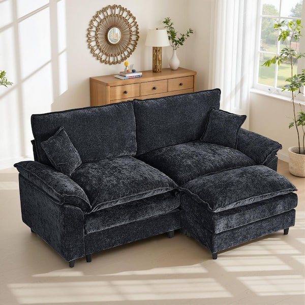 Comfy 82.68 in. Pillowed Armrest Chenille 2 Seat Loveseat with Ottoman and Pillows Sectional Sofa in Black
