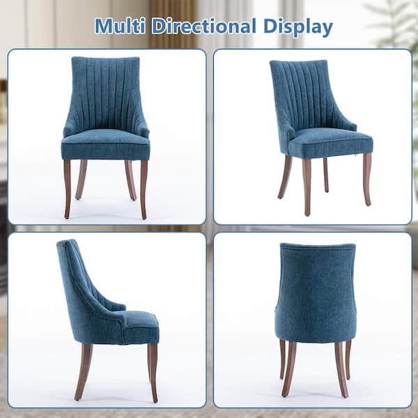 Comfy Blue Linen Channel Tufted Upholstered Dining Chairs Set of 2 with Solid Wood Legs