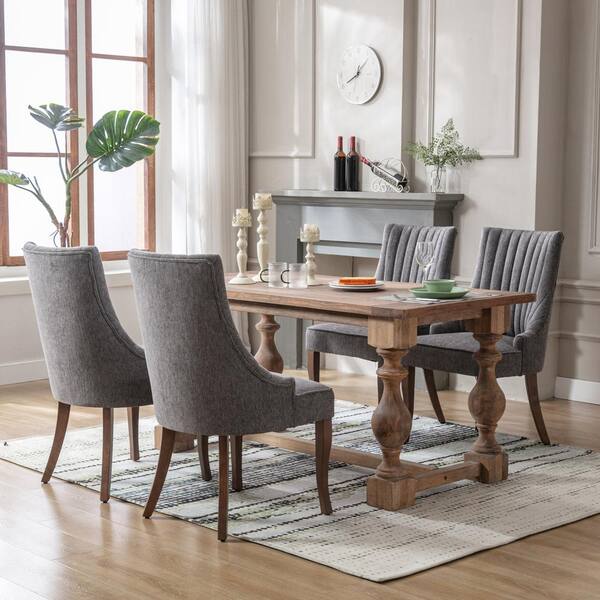 Comfy Gray Linen Channel Tufted Upholstered Dining Chairs Set of 2 with Solid Wood Legs