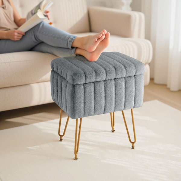 Grey Faux Fur Soft Padded Rectangular Accent Small Ottoman Vanity Stool Chair with Storage and 4 Metal Legs