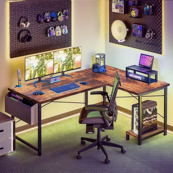 Modern 50 in. L Shaped Rust Brown Wood Reversible Computer Desk Corner PC Gaming Table with Side Storage Bag and Shelf