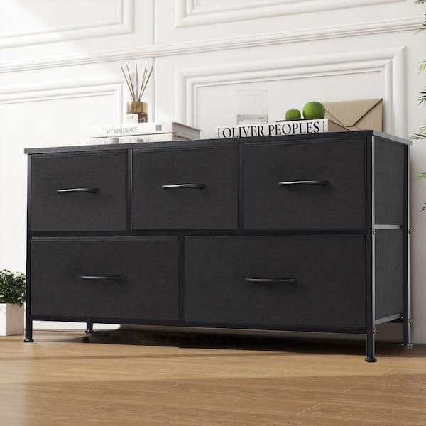 Modern Black 5 Drawer 11.8 in. Wide Chest of Drawers with Fabric Bin, Steel Frame, Wood Top for Bedroom, Entryway