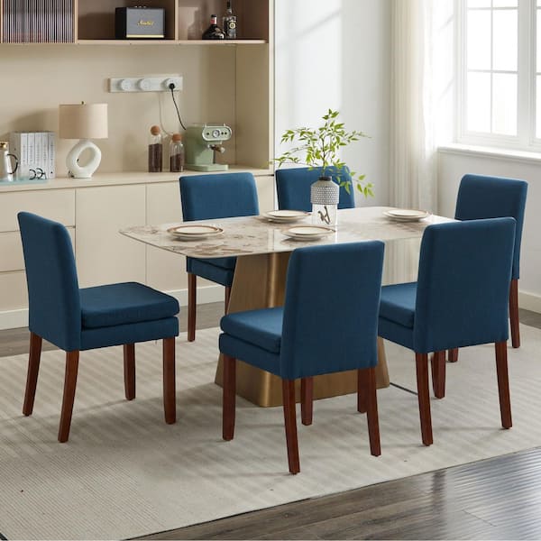 Modern Navy Blue Linen Kitchen Dining Chair Set of 2 with Thick Padded Cushioned Seat and Wood Legs