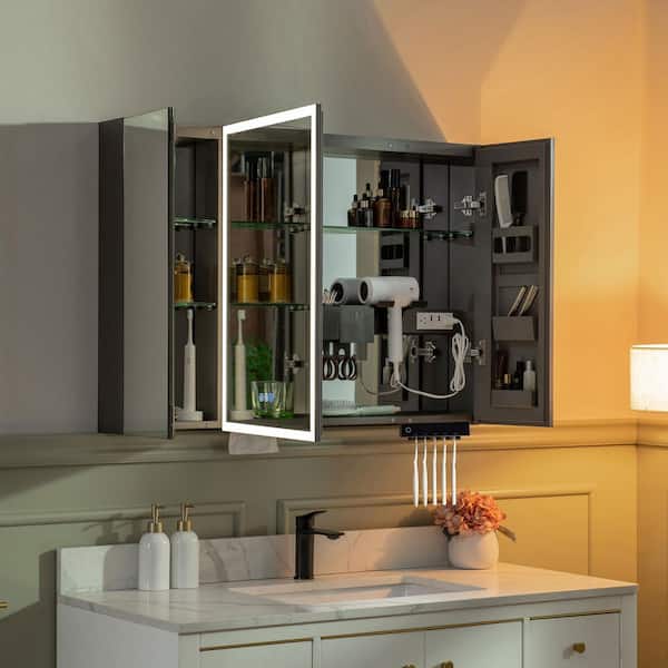 39.4 in. W x 27.75 in. H Large Rectangular Aluminum Surface Mount 3-Door LED Lighted Medicine Cabinet with Mirror