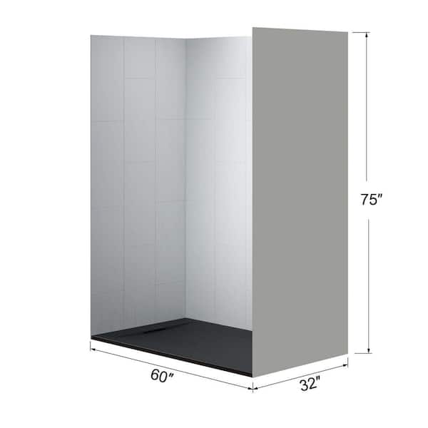 60 in. L x 32 in. W x 75 in. H 4-Pieces Alcove Shower Kit with Glue Up Shower Wall and Shower Pan in White and Black/BN