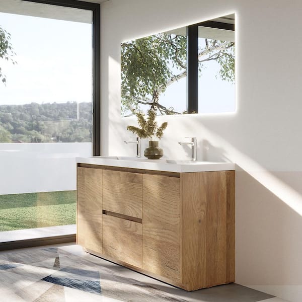 MT 59 in. W x 19.6 in. D Double Sink Freestanding Bath Vanity in Mature Oak with White Resin Vanity Top