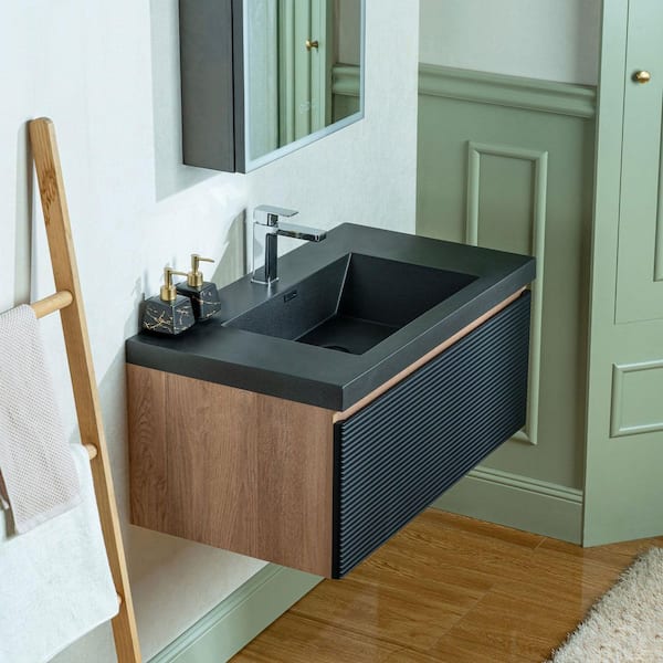 TN 35.38 in. W x 19.63 in. D Single Sink Floating Bath Vanity in Mature Oak with Matte Black Quartz Top