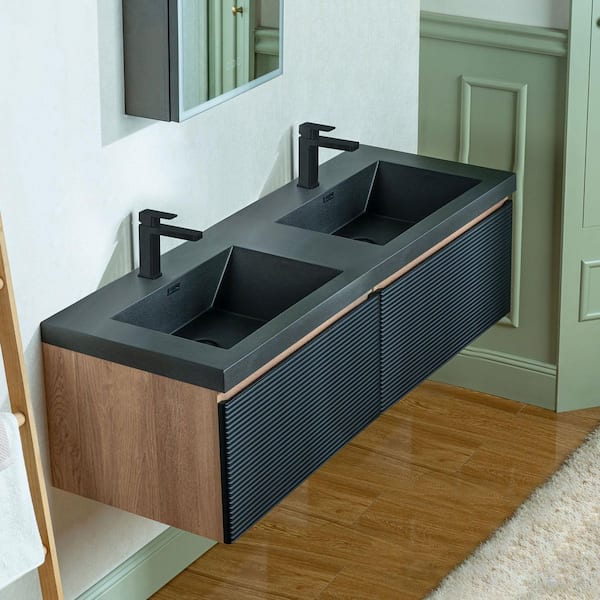 TN 59 in. W x 19.63 in. D Double Sink Floating Bath Vanity in Mature Oak with Matte Black Quartz Top