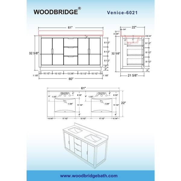 Venice 61 in. W x 22 in. D x 38 in. H Bath Vanity in Grey with Fish Belly Engineered Marble Top with White Basin