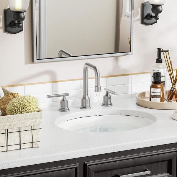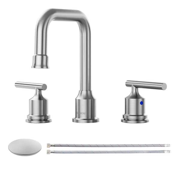 8 in. Widespread Double Handle High Arc Bathroom Faucet with Drain Kit Included in Brushed Nickel