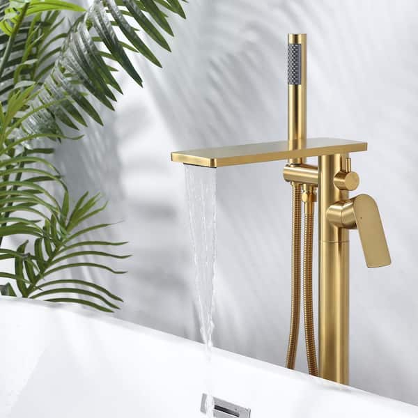 Brass Freestanding Bathtub Faucet Single-Handle Floor Mount Claw Foot Tub Faucet with Hand Shower in Gold