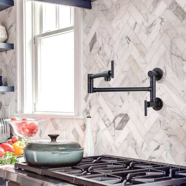 Brass Wall Mounted Pot Filler with Control Double Joint Swing Arm in Oil Rubbed Bronze