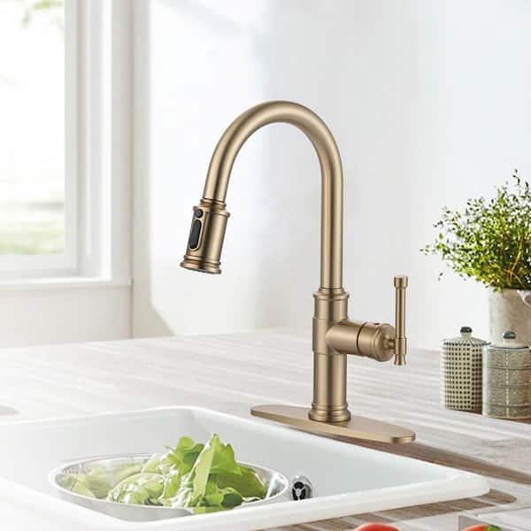 Brushed Gold 16.2 in. Single Handle Pull Down Sprayer Kitchen Faucet with 360° Spout Swivel in Stainless Steel