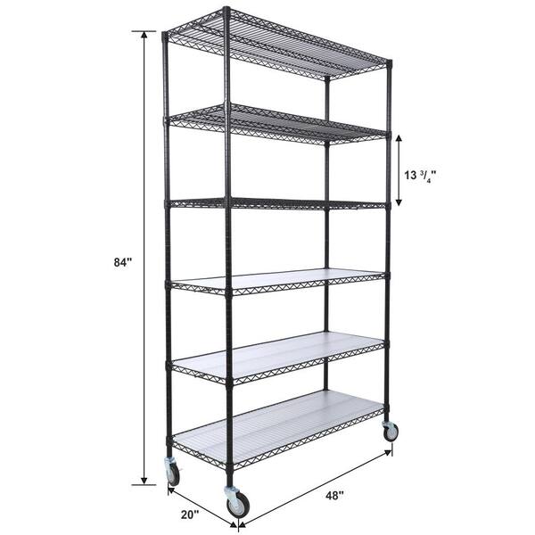 6 Tier NSF Metal Black Heavy Duty Adjustable Storage Rack, 84"H x 48"L x 20"D, with Wheels and Shelf Liners