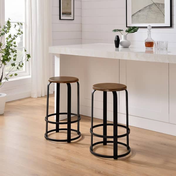 26 in. Dark Coffee/Black Backless Metal-Frame Stackable Wood-Seat Bar Stool, Set of 2