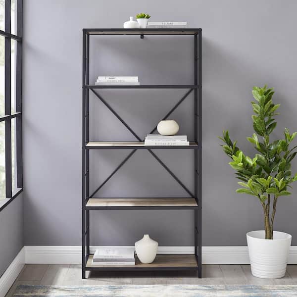 63 in. Gray Wash/Black Metal 4-shelf Etagere Bookcase with Open Back