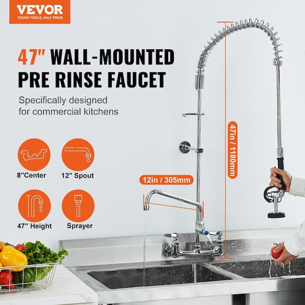 Wall-Mounted Kitchen Faucet Double Handle Pull Down Sprayer Kitchen Faucet 47 in. Tall 8 in. Apart in Silver