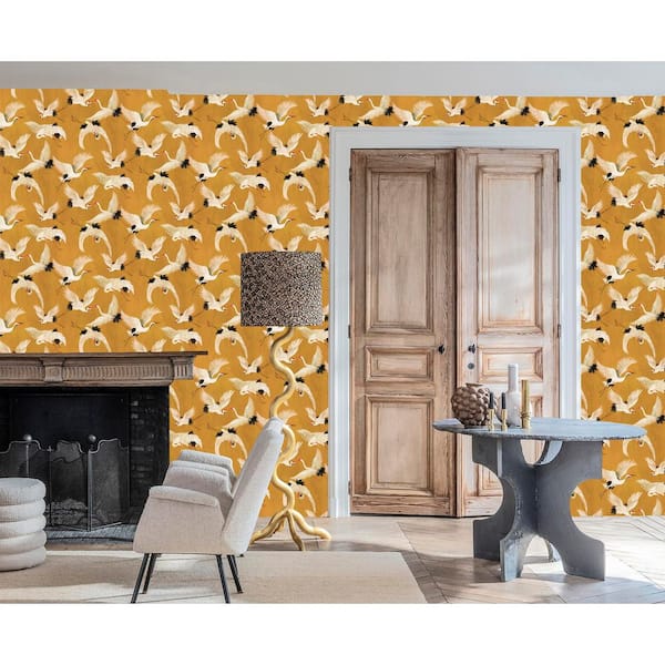 Ochre Cranes in Flight Print Non Woven Non-Pasted Textured Wallpaper 57 sq. ft.