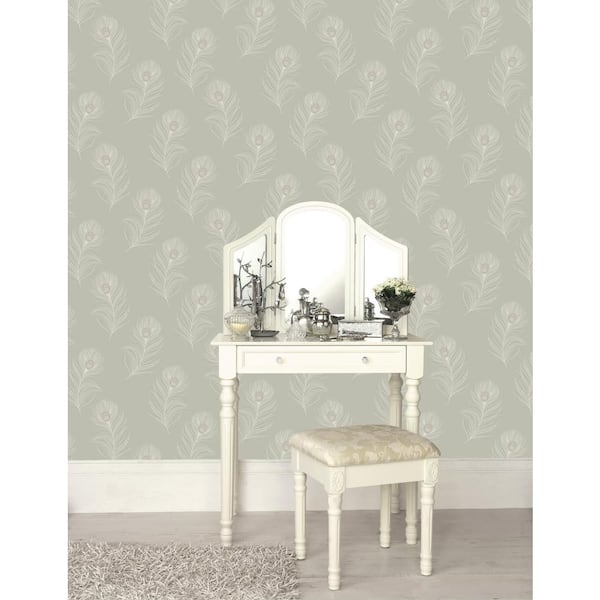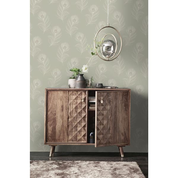 Sage Sequined Falling Peacock Feathers Print Non Woven Non-Pasted Textured Wallpaper 57 Sq. Ft.