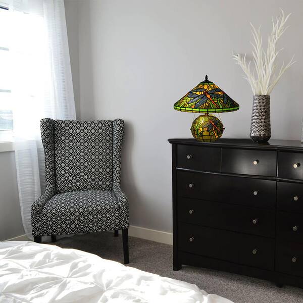 16 in. Green Dragonfly Double Lit Table Lamp with Brown Base