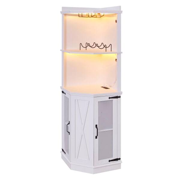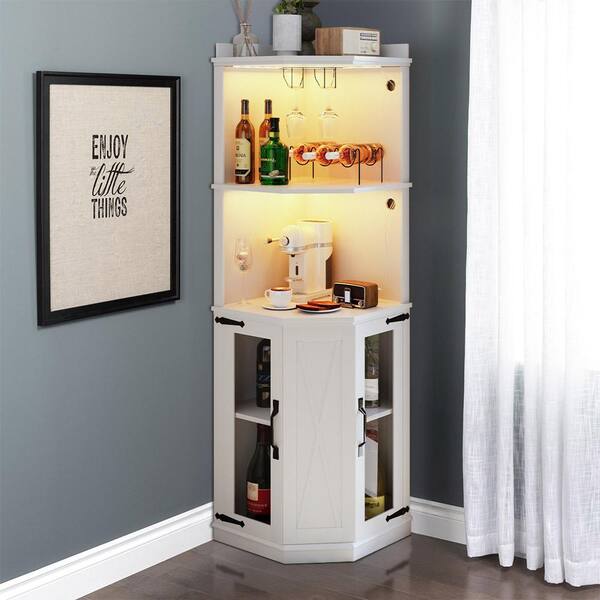 3-Bottle Count Quantity White Corner Bar Cabinet with Power Outlet, Farmhouse Wine Rack with Adjustable Shelves