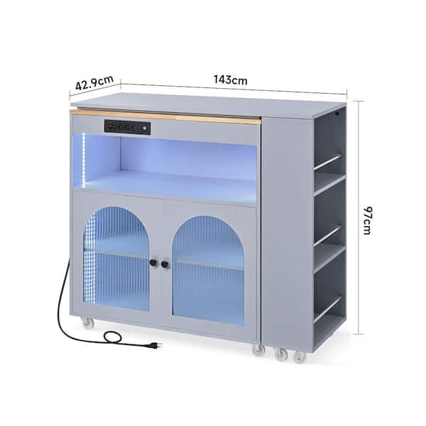 Rolling Kitchen Cart with Extended Table and Wheels with LED Lights, Power Outlets and Glass Door in Grey Blue