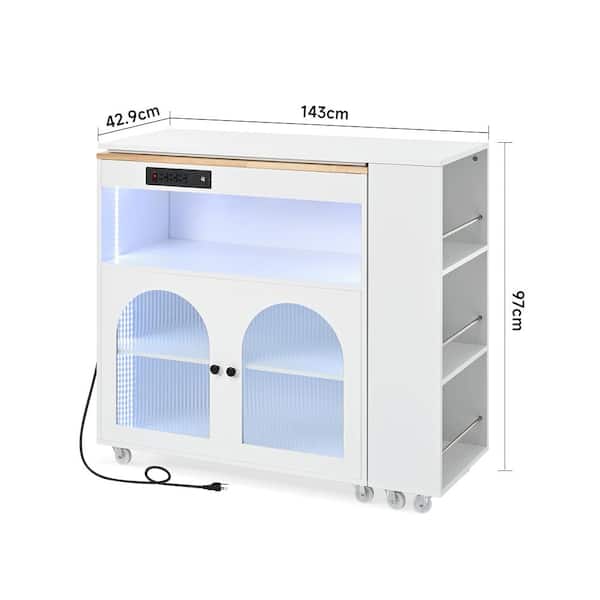Rolling Kitchen Cart with Extended Table and Wheels with LED Lights, Power Outlets and Glass Door in White