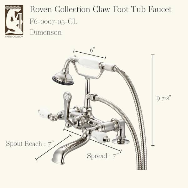 3-Handle Claw Foot Tub Faucet with Labeled Porcelain Lever Handles and Handshower in Polished Nickel PVD