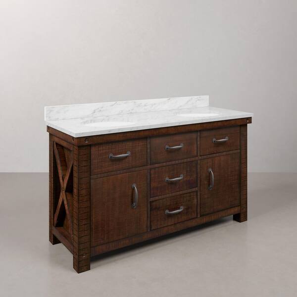 Aberdeen 60 in. W x 22 in. D Vanity in Rustic Sienna with Marble Vanity Top in White with White Basin and Mirror