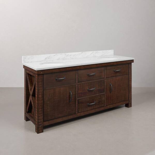 Aberdeen 72 in. W x 22 in. D Vanity in Rustic Sienna with Marble Vanity Top in White with White Basin and Mirror